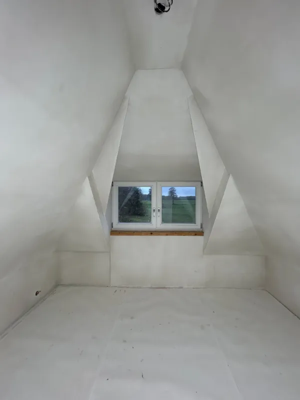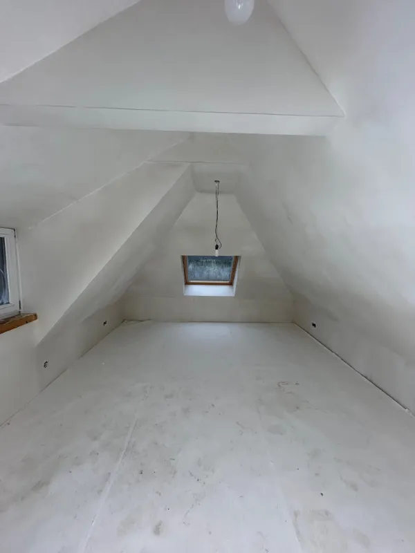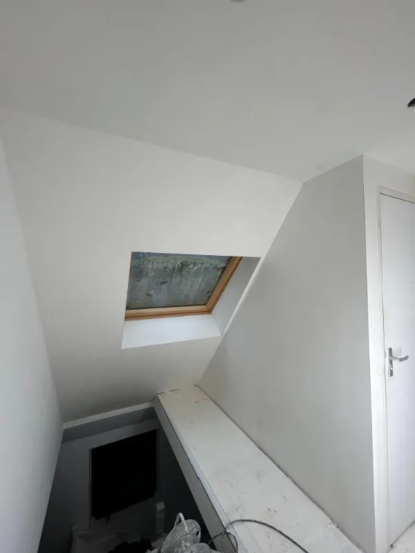 Zolderkamers met schuine wanden behoren tot de meest uitdagende stucprojecten. Elk vlak loopt anders, niets is recht en alles vraagt om maatwerk. Dit is waar vakmanschap Ʃcht het verschil maakt.
